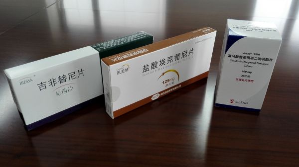 资料图片:这是用于治疗慢性乙型肝炎的替诺福韦酯和用于治疗非小细胞肺癌的埃克替尼、吉非替尼。新华社发