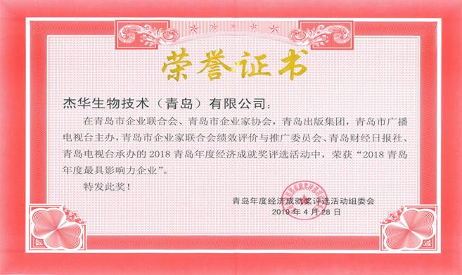 本次活动对2018青岛十大年度经济事件、2018十大年度经济人物、2018年度最具创新力企业进行了颁奖。“杰华生物获评山东省唯一独角兽企业”荣膺2018青岛十大年度经济事件第四位,杰华生物同时被评为最具影响力企业和最具创新力企业。