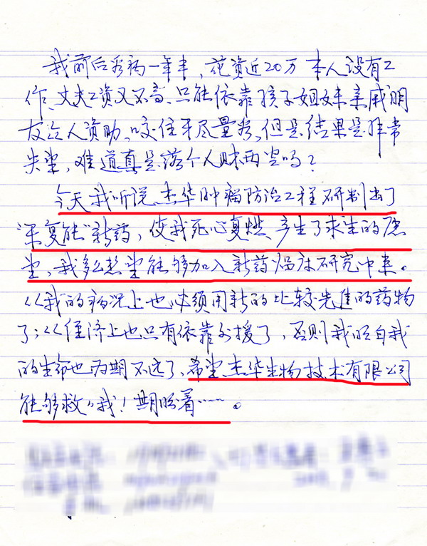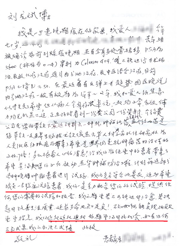 来自北京的癌症患者家属给杰华董事长刘龙斌博士寄来临床研究申请书