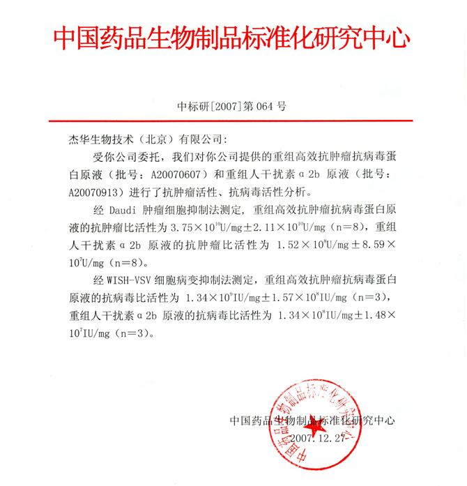 (1)由于采用生物学测定法,每次实验结果有一定波动,因此需要重复多次测量,再取平均值,以使结果真实可靠。按中国药品生物制品标准化研究中心的规定,对抗肿瘤活性测定共重复进行8次(即报告中n=8),抗病毒活性测定方法比较稳定,共进行了3次重复测量(即报告中n=3)。本公司抗肿瘤和抗病毒活性的最终结果均是以平均值±标准差表示。