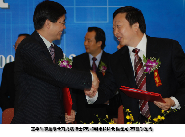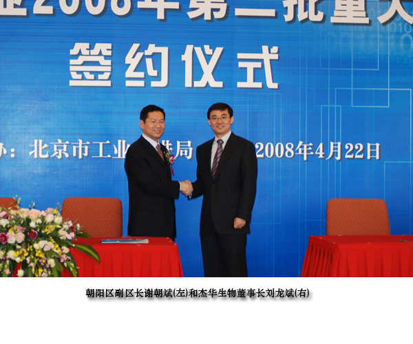 杰华生物的项目,与北京市重点支持生物工程和医药产业以及北京市鼓励“高端、高效、高辐射”的产业政策不谋而合,作为拉动和促进北京市生物经济快速发展的重要一员,受到了北京市政府的高度重视。2008年4月22日,成为北京工业2008年第二批重大项目落户北京,北京市郭金龙市长、陆昊副市长、苟仲文副市长、北京市工促局李平局长及朝阳区程连元区长等,亲自为杰华生物(北京)有限公司落户北京市举行了签约仪式。