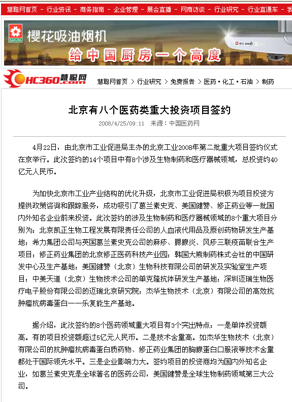 北京有八个医药类重大投资项目签约