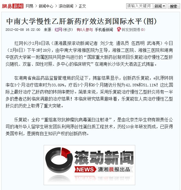 下一条: 慢性乙肝新药物"乐复能"在长沙揭盲 疗效已达国际水平 2012-02-09