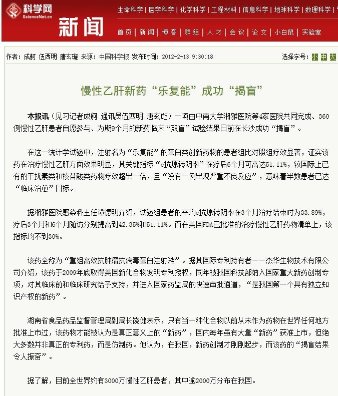 下一条:我国第一个独立知识产权的慢性乙肝新药“揭盲” 2012-02-13