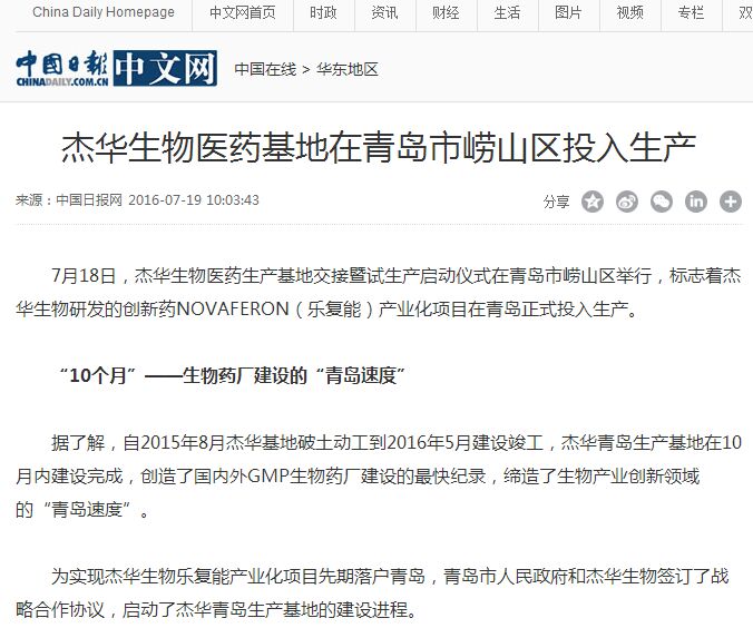 中国日报:杰华生物医药基地在青岛市崂山区投入生产