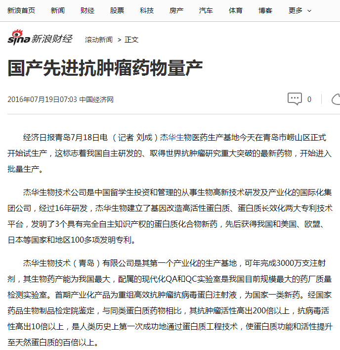 下一条:青岛财经网:杰华生物医药基地崂山区投产 年产3000万支抗肿瘤蛋白药物注射剂 2016-07-18
