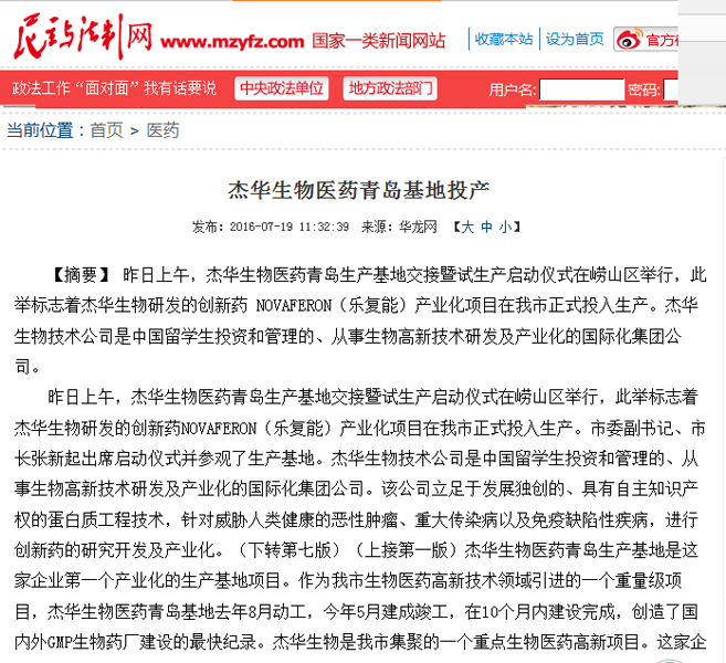 上一条:中国新闻网:杰华生物医药生产基地启动 缔造“青岛速度” 2016-07-21