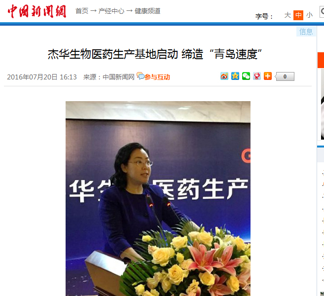 中国新闻网:杰华生物医药生产基地启动 缔造“青岛速度”