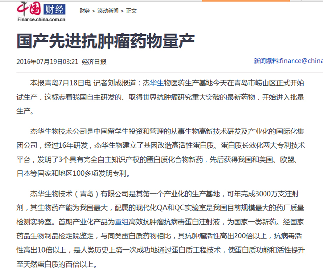 上一条:大众网:杰华生物医药生产基地在青岛投入试生产 2016-07-21