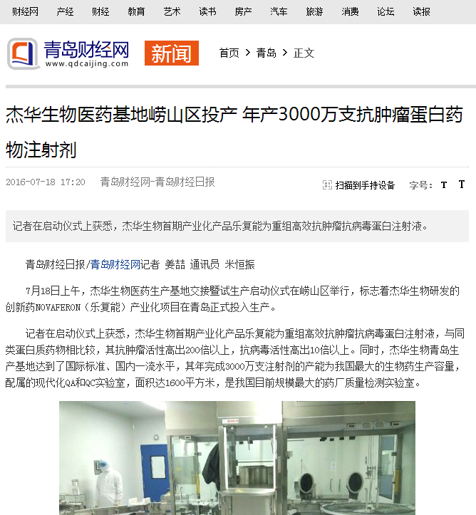 青岛财经网:杰华生物医药基地崂山区投产 年产3000万支抗肿瘤蛋白药物注射剂
