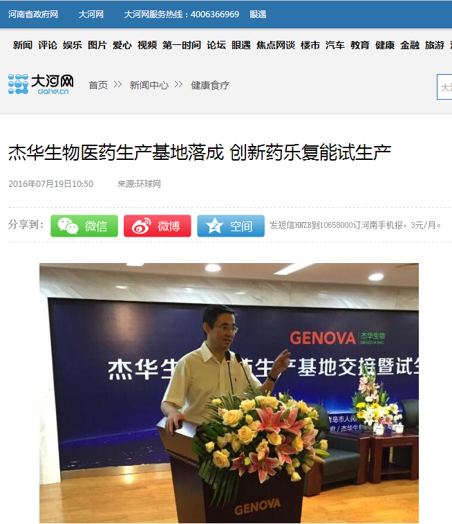 大河网:杰华生物医药生产基地落成 创新药乐复能试生产