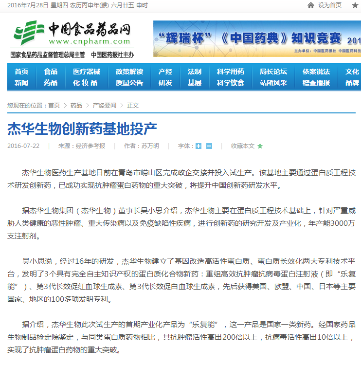 上一条:光明网:杰华生物医药基地投产 2016-07-29