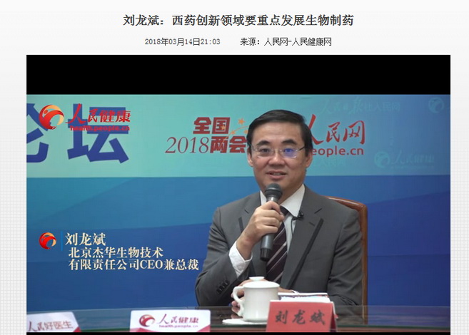 2018年全国“两会”期间,人民网“健康中国人”特别节目专访了杰华生物集团CEO刘龙斌博士,就中国创新药的发展、杰华生物开展创新药研发等社会关注的问题回答了主持人的提问。刘龙斌博士表示,杰华生物将始终坚持只做原创新药的宗旨,以“创新为人类健康”为愿景,为健康中国建设贡献力量。