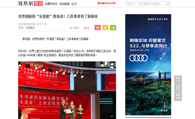 凤凰网:世界级新药“乐复能”青岛造!乙肝患者有了新福音