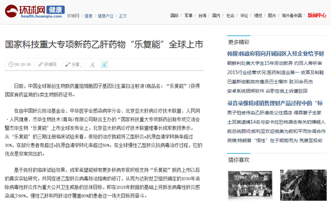 环球网:国家科技重大专项新药乙肝药物“乐复能”全球上市