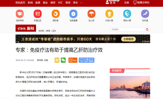和讯网:专家:免疫疗法有助于提高乙肝防治疗效