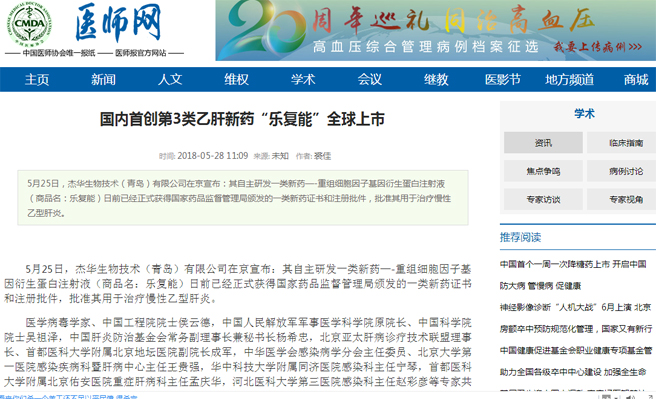 医师网:国内首创第3类乙肝新药“乐复能”全球上市
