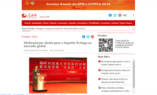 人民网(葡萄牙语):Medicamento chinês para a hepatite B chega ao mercado global