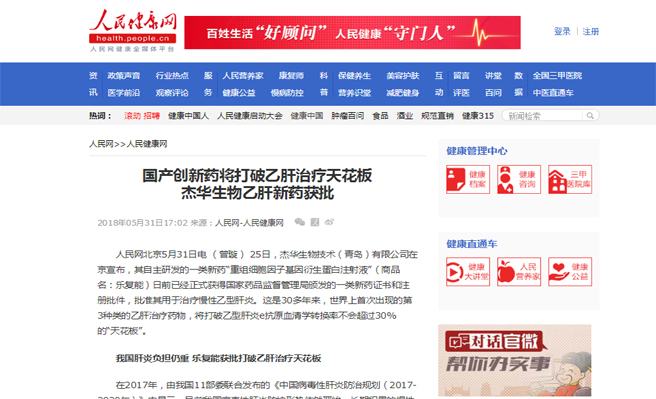 人民网:国产创新药将打破乙肝治疗天花板 杰华生物乙肝新药获批