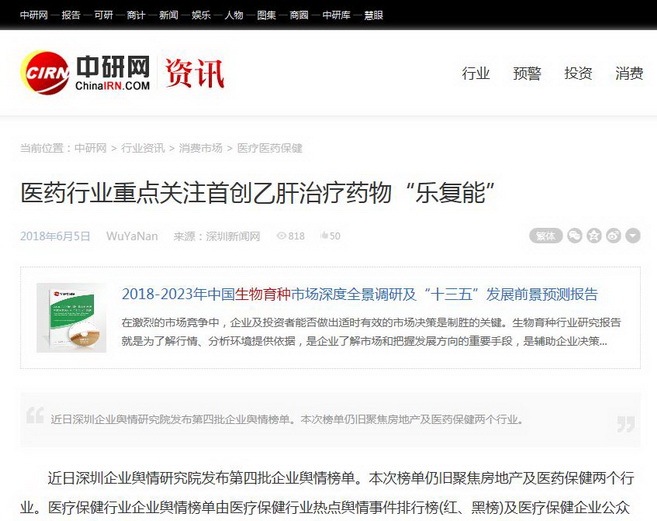 中研网:医药行业重点关注首创乙肝治疗药物“乐复能”