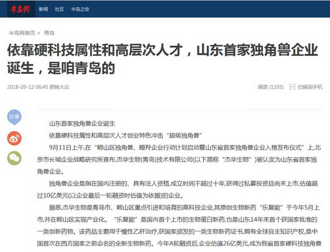 上一条:半岛网-半岛都市报:山东首只"独角兽"花落崂山 31家企业成"瞪羚" 2018-09-12