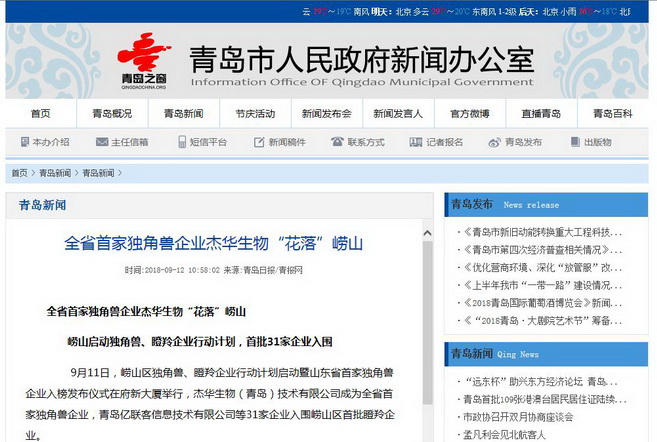 青岛人民政府新闻办:全省首家独角兽企业杰华生物“花落”崂山