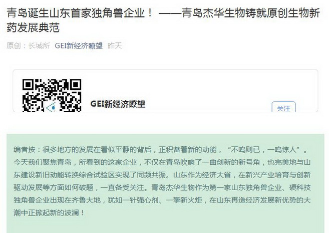 长城所:青岛诞生山东首家独角兽企业! ——青岛杰华生物铸就原创生物新药发展典范