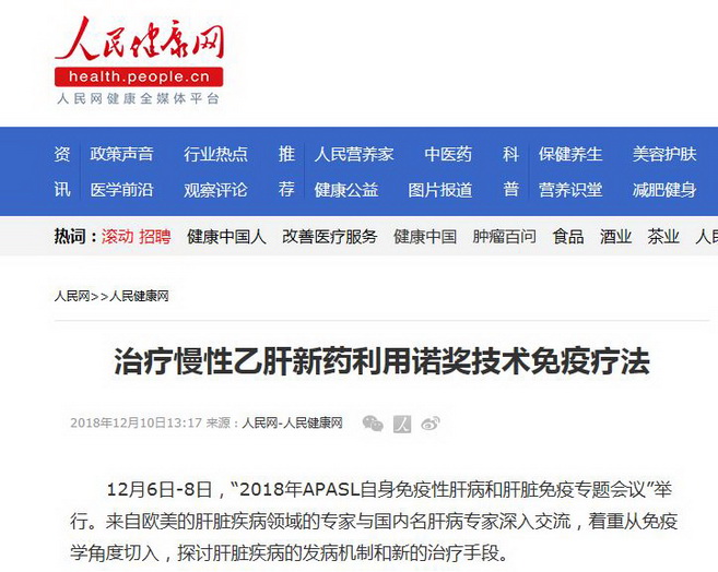 人民网:治疗慢性乙肝新药利用诺奖技术免疫疗法