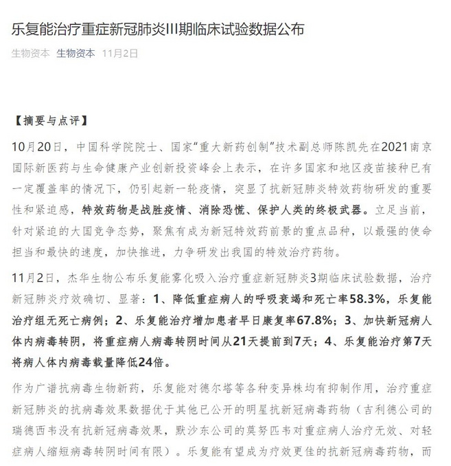 生物资本: 乐复能治疗重症新冠肺炎III期临床试验数据公布