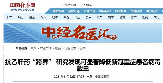 中国经济网:抗乙肝药“跨界” 研究发现可显著降低新冠重症患者病毒载量