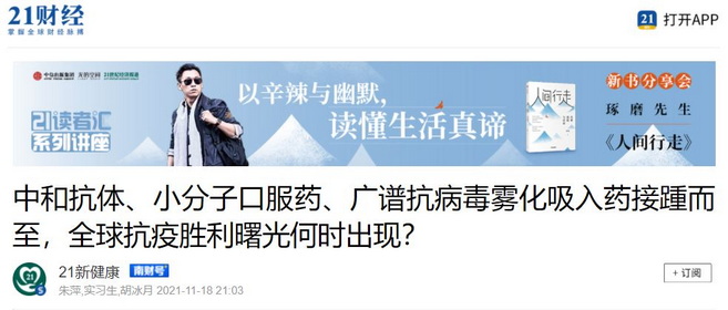 21财经:中和抗体、小分子口服药、广谱抗病毒雾化吸入药接踵而至,全球抗疫胜利曙光何时出现?