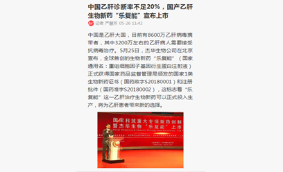 5月25日,杰华生物技术(青岛)有限公司在京宣布:其自主研发一类新药—-重组细胞因子基因衍生蛋白注射液(商品名:乐复能)日前已经正式获得国家药品监督管理局颁发的一类新药证书和注册批件,批准其用于治疗慢性乙型肝炎。