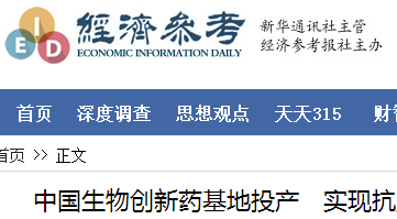 经济参考:中国生物创新药基地投产 实现抗肿瘤蛋白药物重大突破