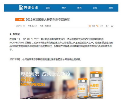 2017年3月2日,药渡头条:2016年我国重大新药创制专项进展新闻稿报道了杰华生物研发治疗乙肝的国家I类新药NOVAFERON—乐复能的最新进展。乐复能系“十一五”、“十二五”国家重大新药创制专项支持项目。