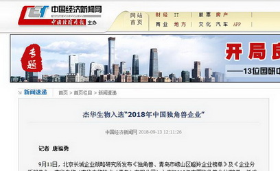 中国经济新闻网:杰华生物入选“2018年中国独角兽企业”