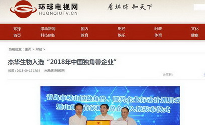 环球电视网:杰华生物入选“2018年中国独角兽企业”