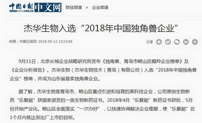 中国日报:杰华生物入选“2018年中国独角兽企业”