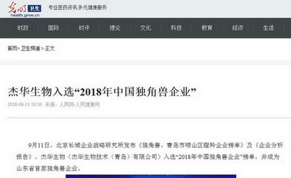 光明网:杰华生物入选“2018年中国独角兽企业”