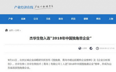 产业经济在线:杰华生物入选“2018年中国独角兽企业”