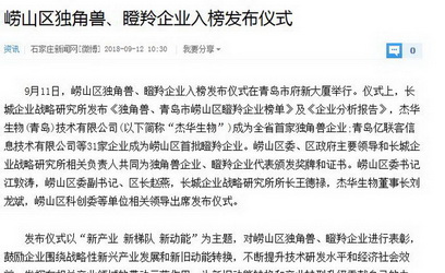 9月11日,北京长城企业战略研究所发布《独角兽、青岛市崂山区瞪羚企业榜单》及《企业分析报告》。杰华生物(杰华生物技术(青岛)有限公司)入选“2018年中国独角兽企业”榜单,并成为山东省首家独角兽企业。