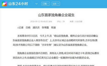 9月11日,青岛市崂山区政府宣布,杰华生物(青岛)技术有限公司被认定为全省首家独角兽企业,这也是中国首家原创生物新药独角兽企业。同时崂山正式启动独角兽、瞪羚企业行动计划,到2020年底,力争引进培育独角兽企业5家,瞪羚企业100家。