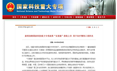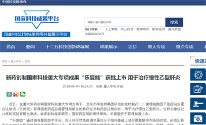 中国科技网:新药创制国家科技重大专项成果“乐复能”获批上市 用于治疗慢性乙型肝炎