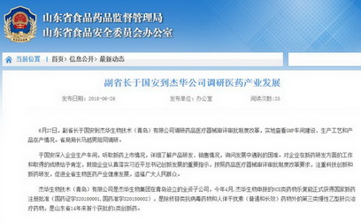 山东省食品药品监督管理局:副省长于国安到杰华公司调研医药产业发展