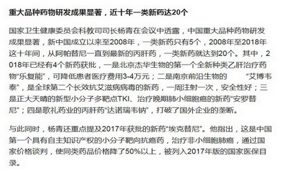 国家卫生健康委员会科教司司长杨青透露,2008年至2018年这十年间,一类新药就达到20个。其中,2018年已经有4个新药获批,一是北京杰华生物的第一个全新种类乙肝治疗药物“乐复能”,可降低患者医疗费用3-4万元。