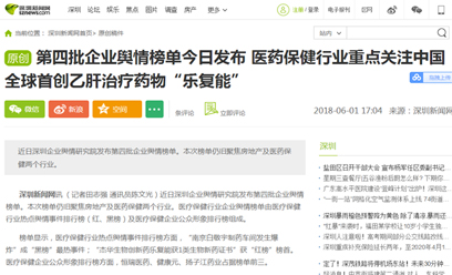 深圳新闻网:第四批企业舆情榜单发布 医药保健行业重点关注中国全球首创乙肝治疗药物“乐复能”