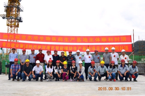 2015年9月30日上午10点58分,青岛市崂山区科创委王刚副主任、毛安成处长、牛海青处长等领导与杰华生物技术(青岛)有限公司全体员工及青岛建安集团施工人员、青岛商业监理工程师,在生产楼屋面举行简短仪式,共同庆祝杰华青岛生产基地生产楼按计划顺利封顶。